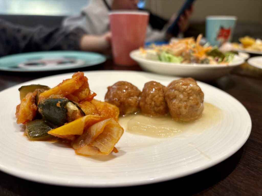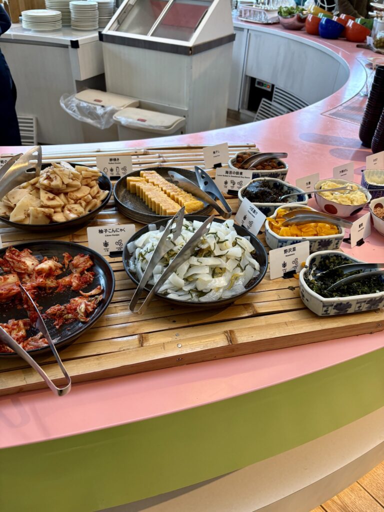 和食では、焼き魚や納豆、漬物といった定番に加え、冷うどんやイカの塩辛なども用意されており、