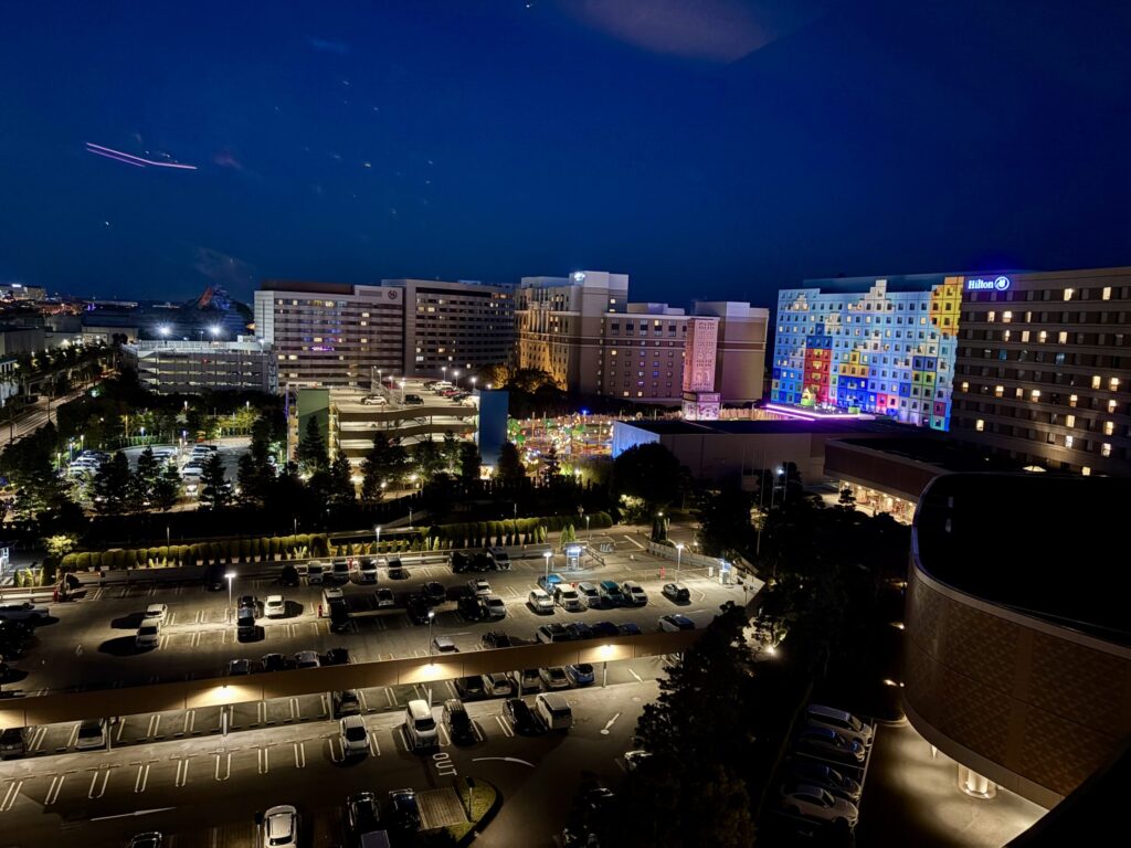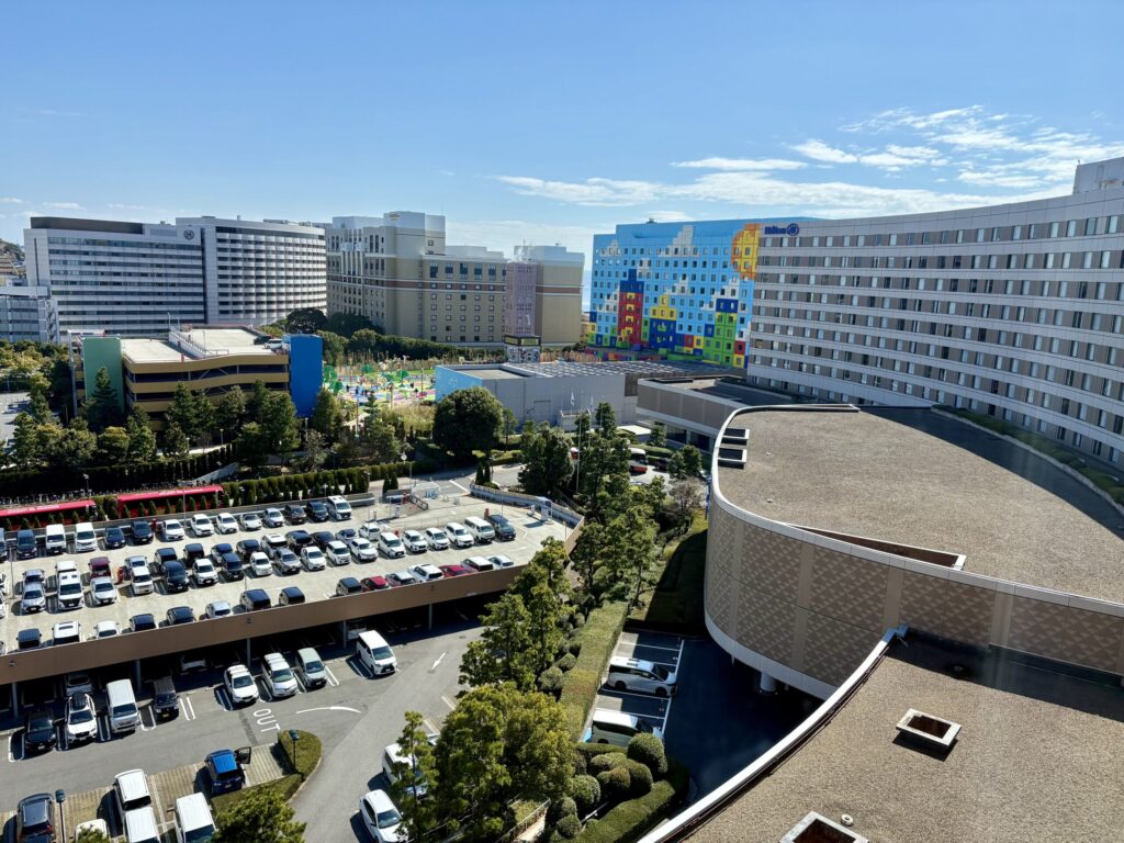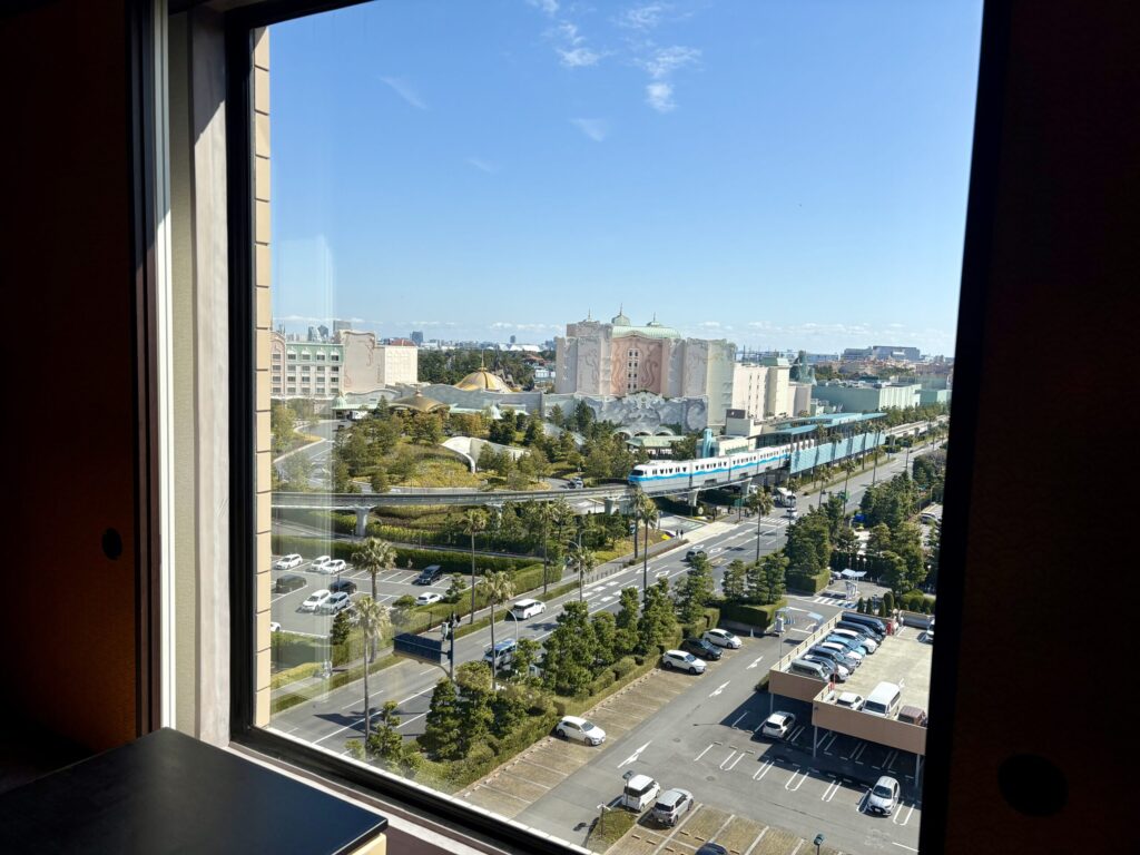 客室からはディズニーリゾートラインや周辺のホテル群を望むことができ、