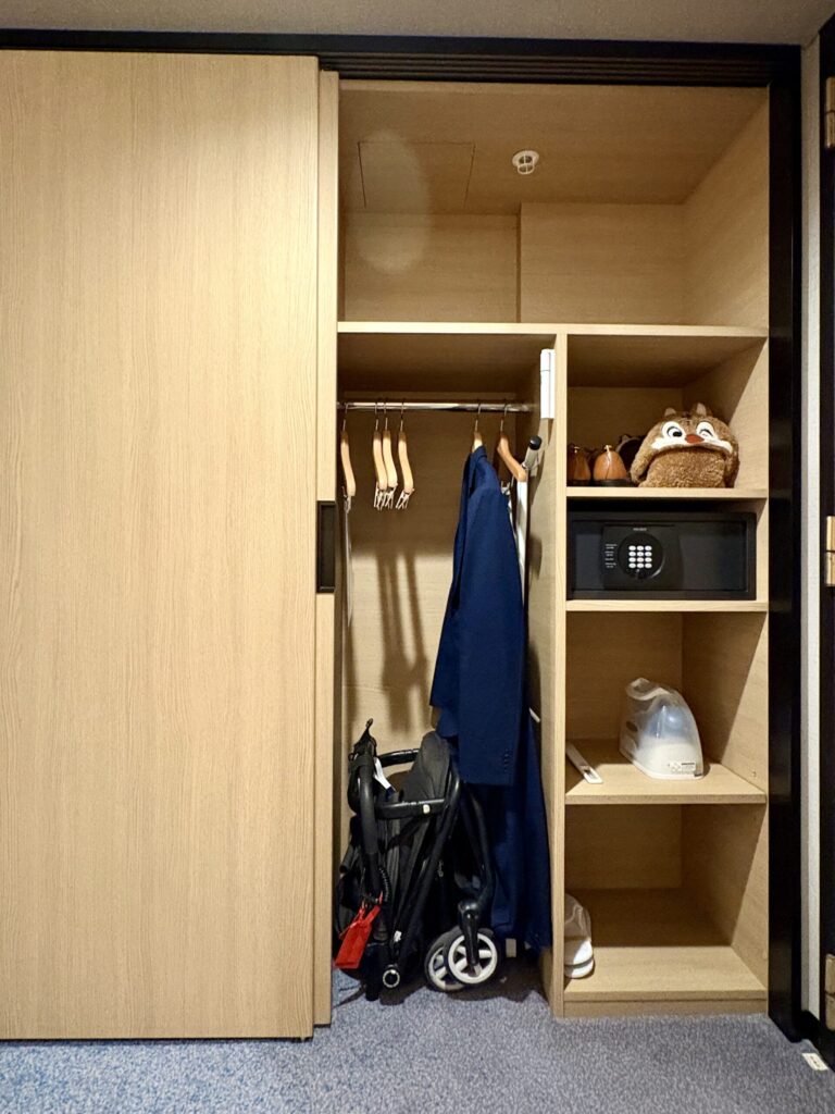 その隣に金庫やアイロンなどが置いてある棚のスペースがあります。