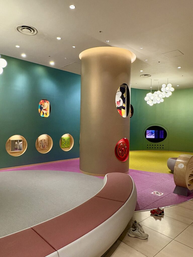 フロント周辺には子ども向けのスペースもあり、アニメが流れているなど、